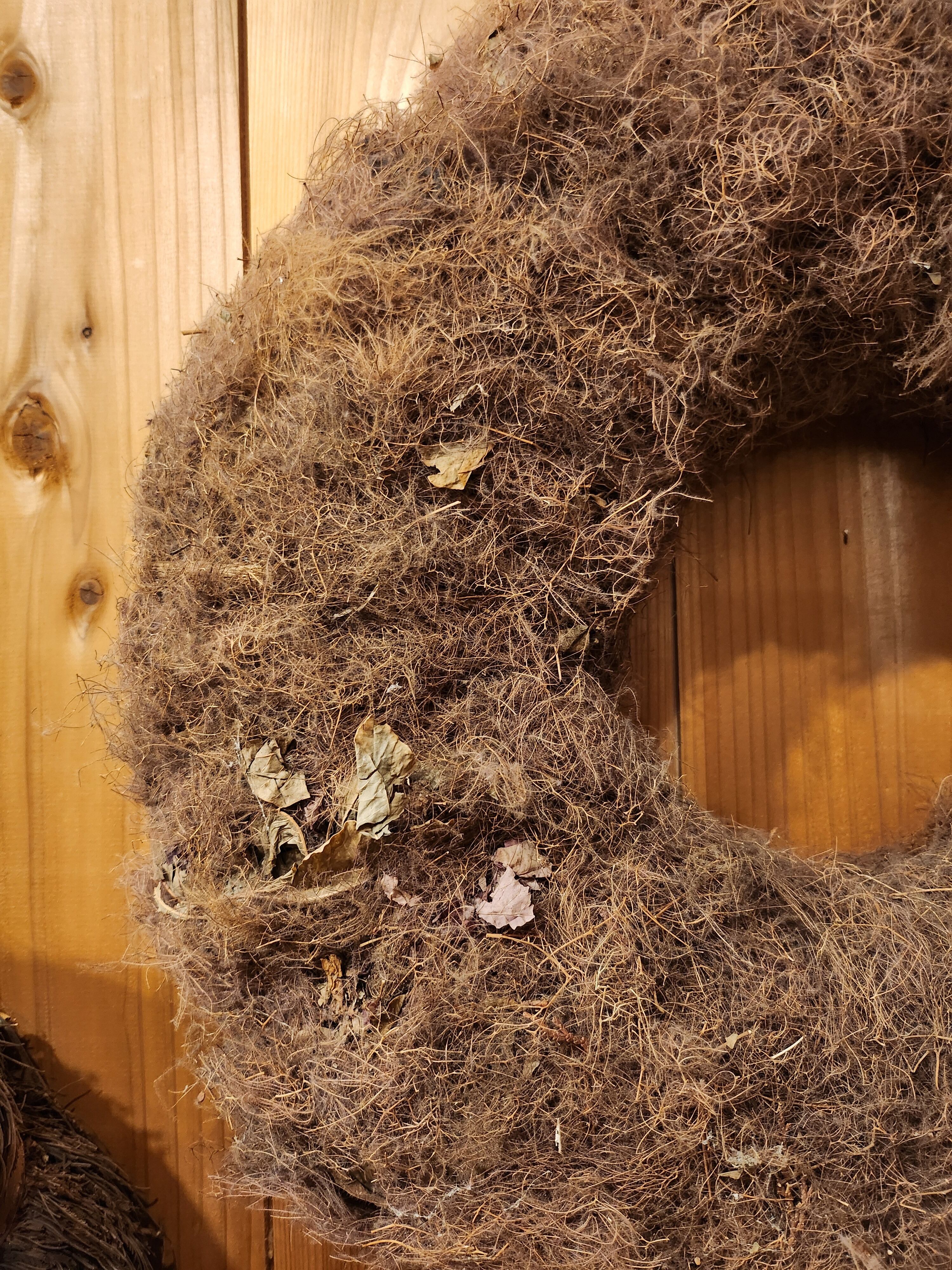 しかし、何年か室内に飾ったあと、屋外のむしろ日に当たるところなどに置いておくと、どんどん白色化していって、リースが仙人のようになっていくのもまた見モノでもあります。