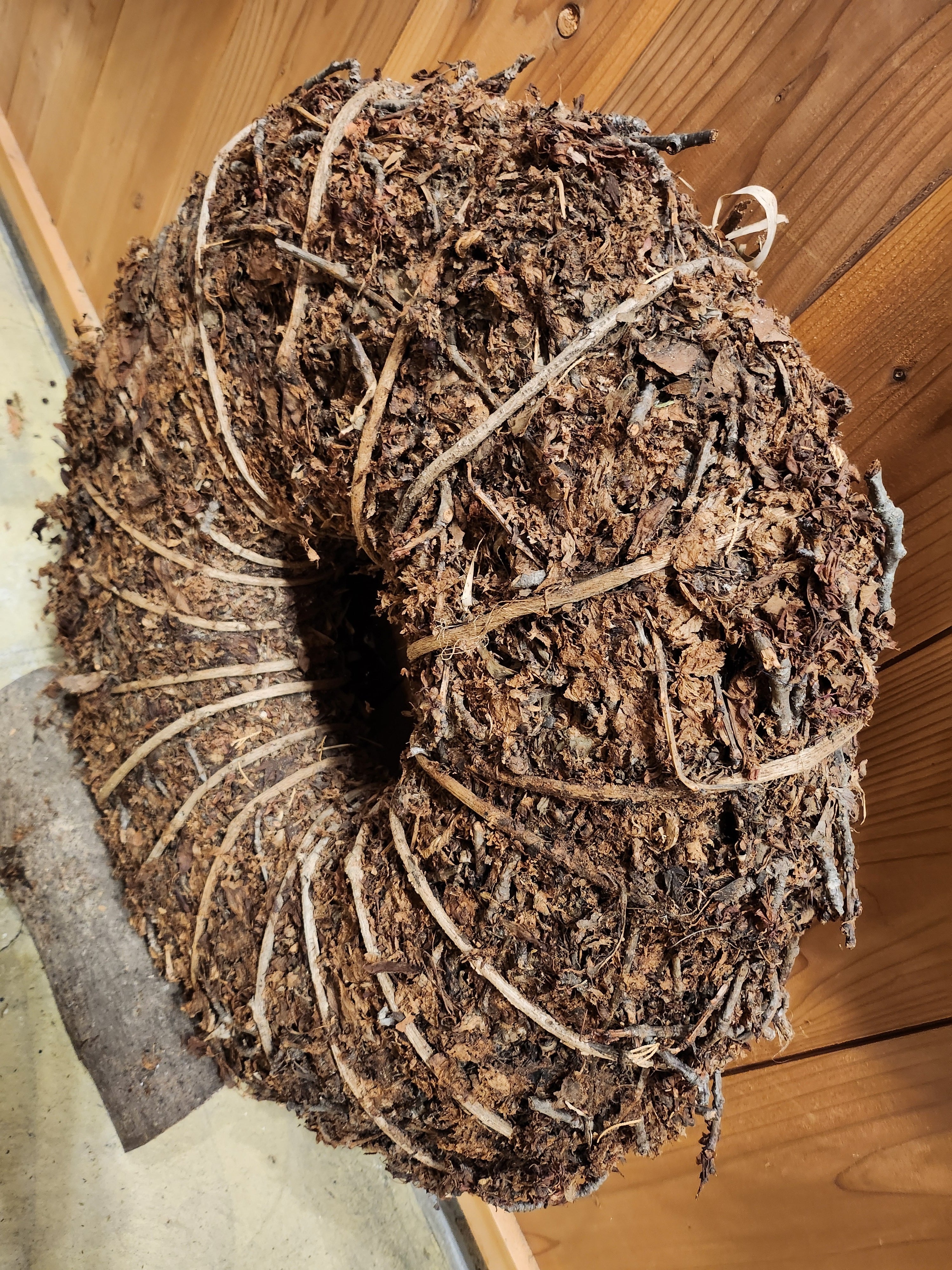 捨てろと言っても聞かないので、その辺にあったツルをいっぱいグルグルに巻いてリースを作り