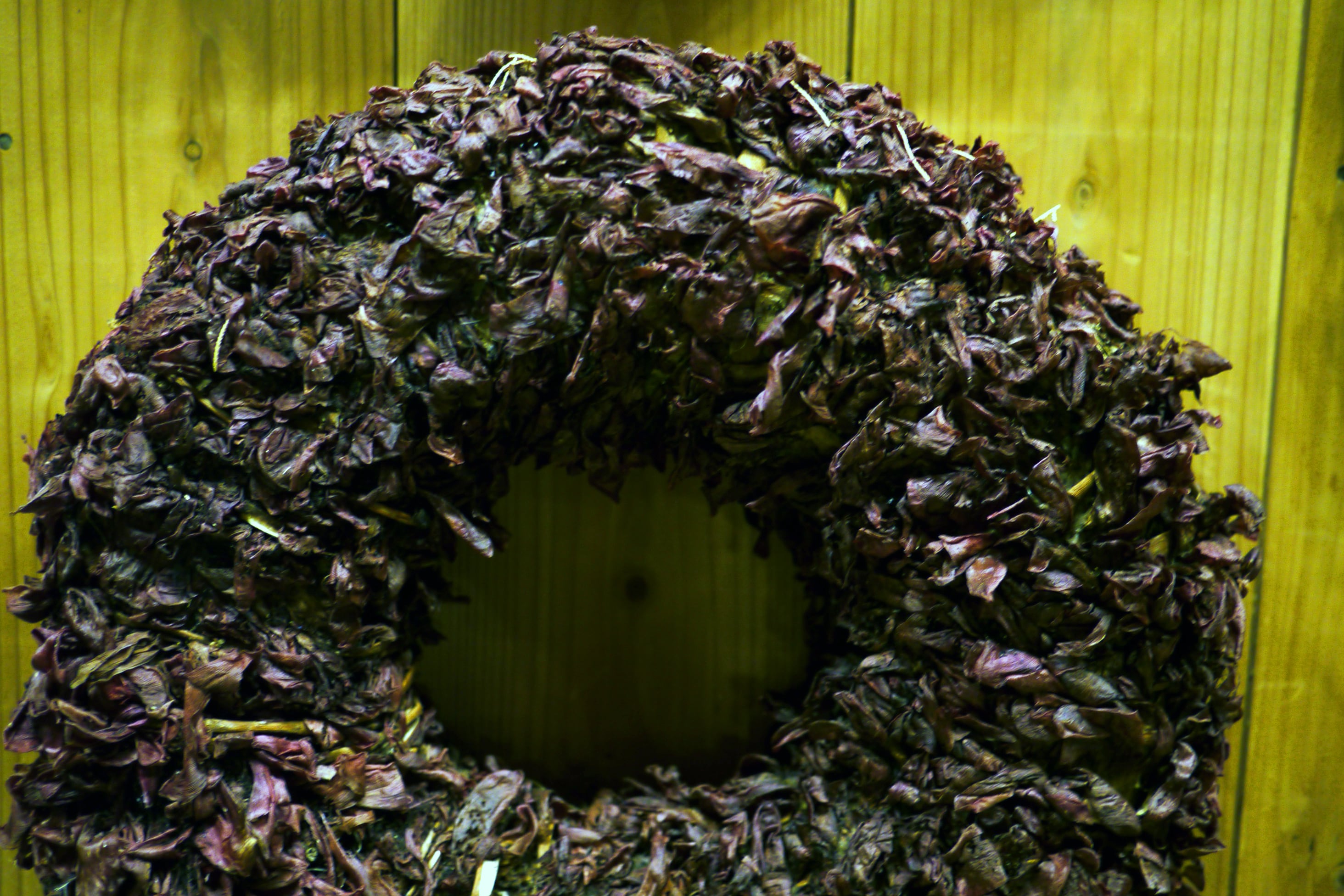 しかし、何年か室内に飾ったあと、屋外のむしろ日に当たるところなどに置いておくと、どんどん白色化していって、リースが仙人のようになっていくのもまた見モノでもあります。